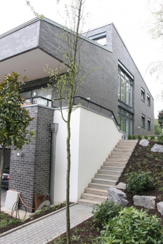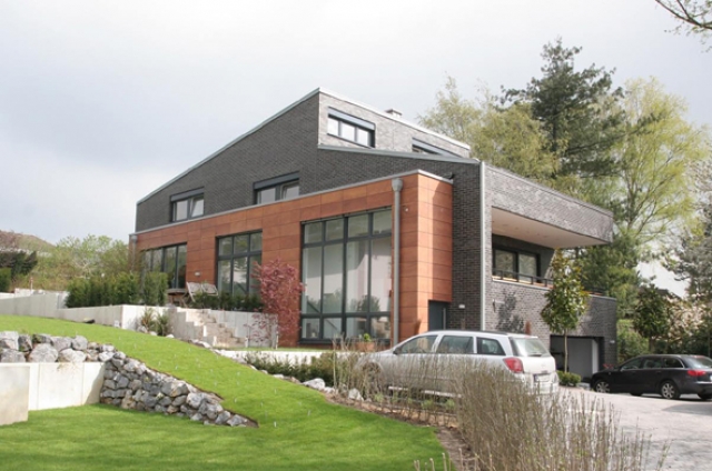 Auf dem östlichen der beiden Grundstücke entstand das Wohnhaus für eine 4-köpfige Familie. Die Grundrissentwicklung paßt sich der Hanglage an und wird durch die Treppenanlage begleitet, welche von außen durch eine Schichtholzfassade ablesbar ist.